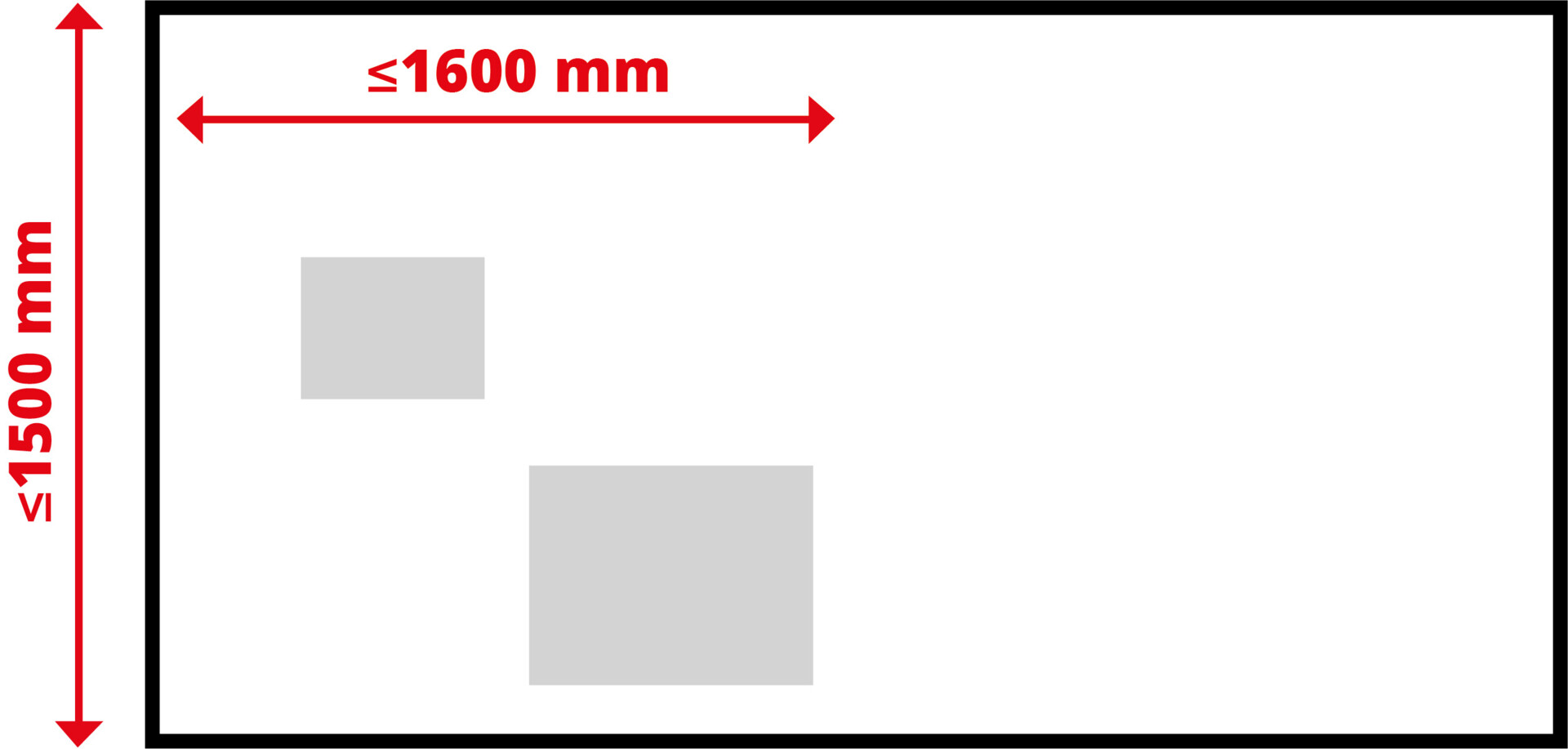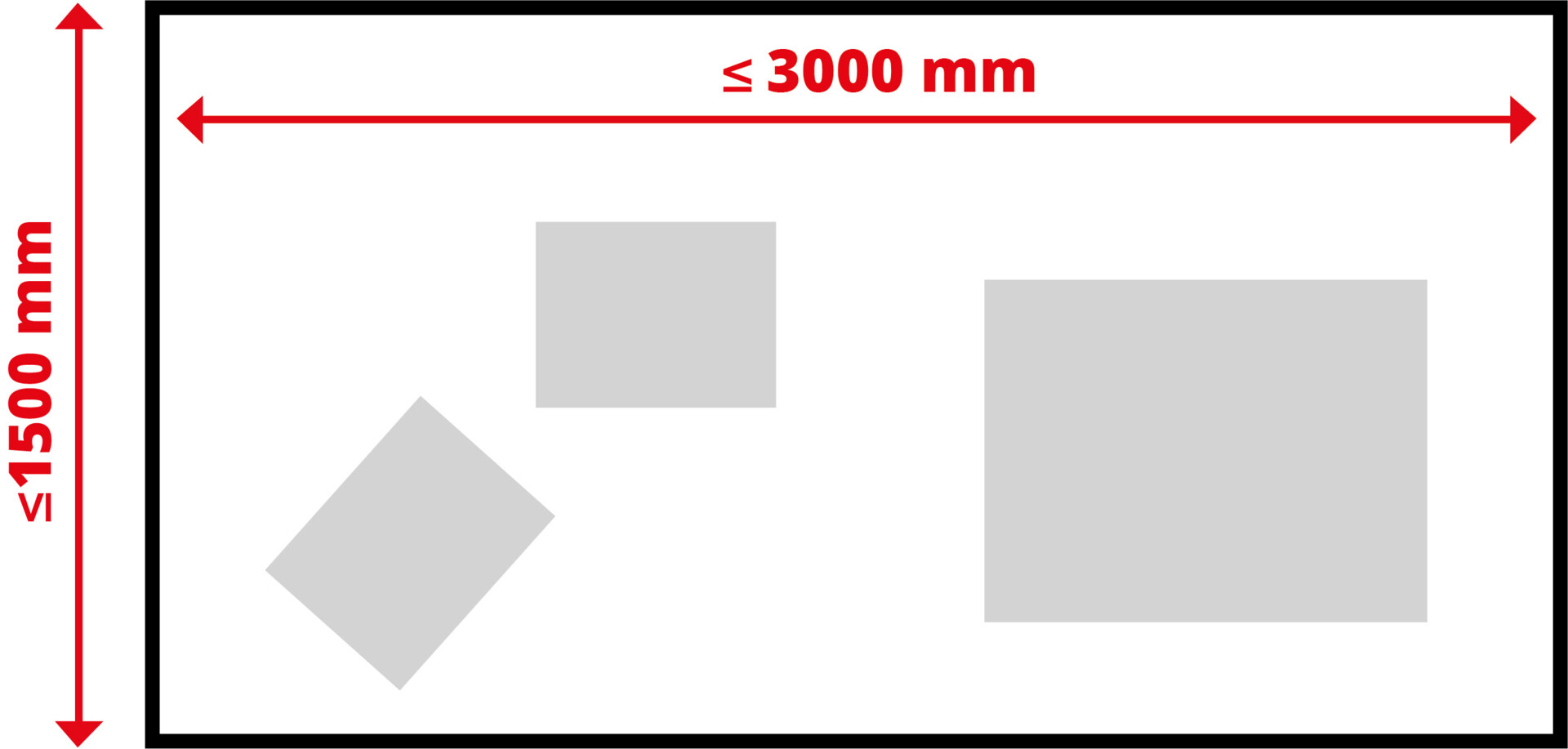 To precisely understand the differences between the two versions of the option, we can look at the pictures. SVS1 has a field of vision, and therefore a working range, of 1600x1500mm. This means that it is possible to position one or more leftovers on the worktable, but these must always be arranged on the left-hand side of the table.