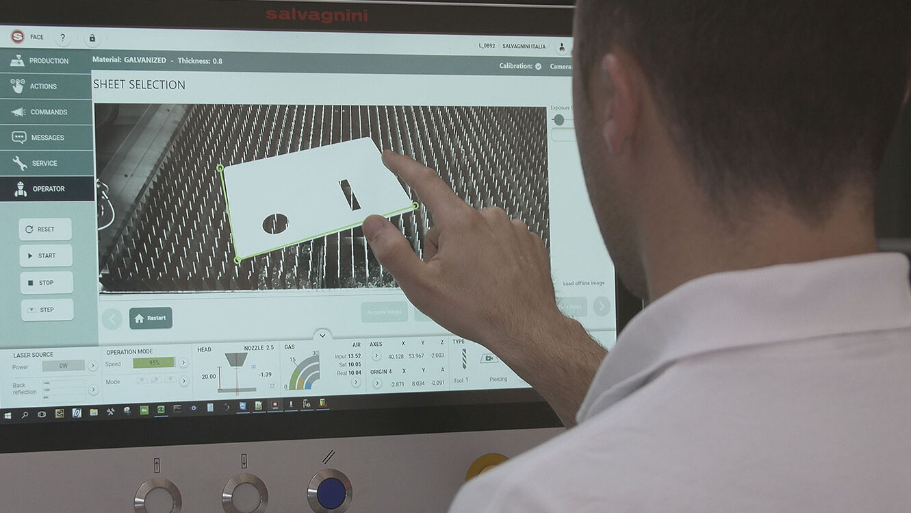 The operator places the sheet metal leftover on the worktable and uses FACE, the Salvagnini human-machine interface, to indicate which is the reference leftover – because there could be more than one on the worktable. The application acquires an image of the leftover, transforms it into a dxf and enters it in the STREAMLASER on machine database as a starting sheet. The operator proceeds to select the parts to be produced, and the application automatically creates the nest and completes the program.