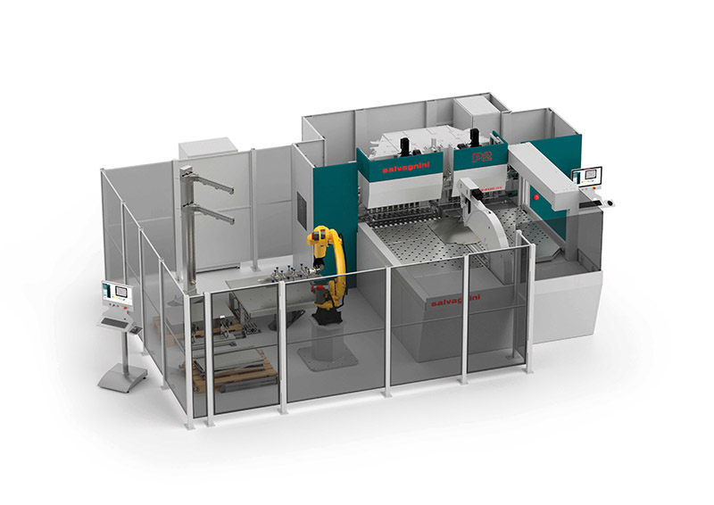 The P-Robot configuration can be customized: Salvagnini proposes simple production flows, with loading/unloading assistance only, and more complex systems including, for instance, automatic pallet handling or third-party integrations such as work centers for corner forming, labeling, laser marking, riveting and welding.