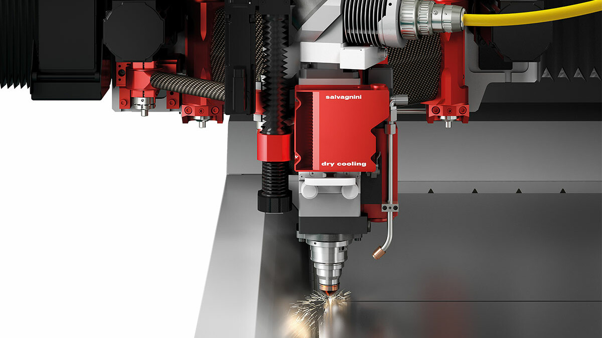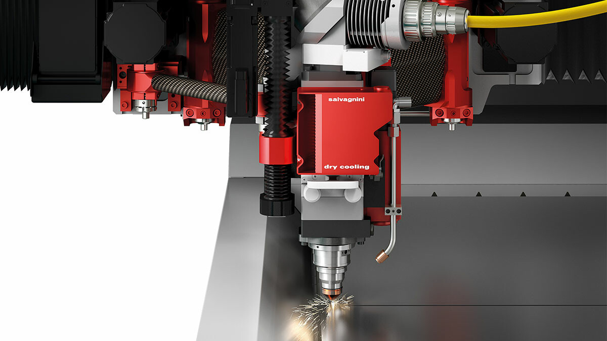 The L5 is equipped with a single laser head, designed by Salvagnini, used to cut all the allowed materials and thicknesses. It is mounted on a carbon fiber compass system with advanced kinematics that moves the head on the XY plane with dynamics of up to 5g on short movements. It is equipped with the patented DRY-COOLING system, used to actively control the temperature of the optics. Its process sensors control and adapt the piercing in real time, monitoring any cutting losses, stopping the process, and restarting it with appropriately corrected parameters. The TRADJUST function, integrated into the proprietary control, ensures automatic parameter modulation according to the trajectories, making the system easier to use.