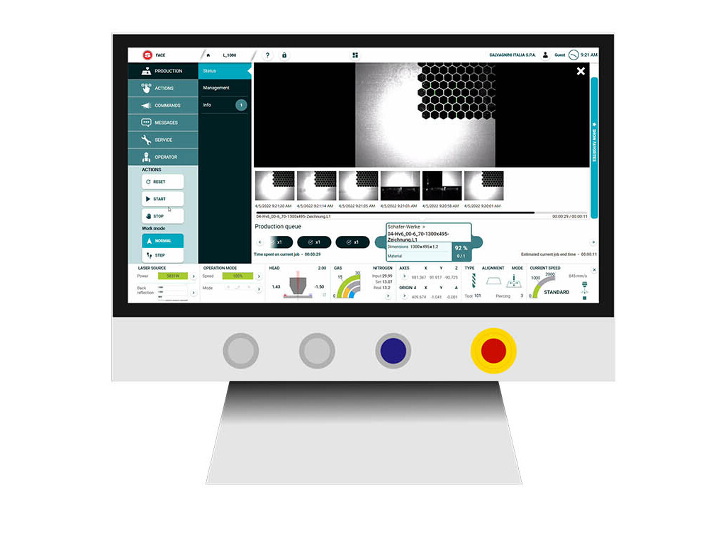 The AVS camera aligns the sheet metal in the work area extremely precisely. With AVS and the largest sheets, the alignment time is shorter than with a standard capacitive sensor. AVS is indispensable for format productions, where the size of the cut part corresponds exactly to that of the starting sheet. Centering the parts on machinings already made on the sheet metal, AVS also extends the possible applications of the laser system. And on board the machine, activities are much faster, because most of the preparatory work is done in the office.