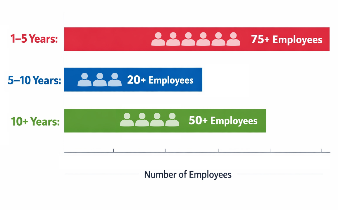 - 5–10 Years: 20+ employees
